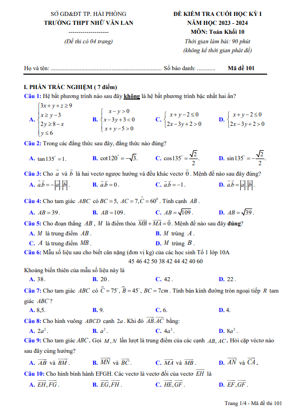Đề cuối học kỳ 1 Toán lớp 10 năm học 2023 – 2024 trường THPT Nhữ Văn Lan – Hải Phòng