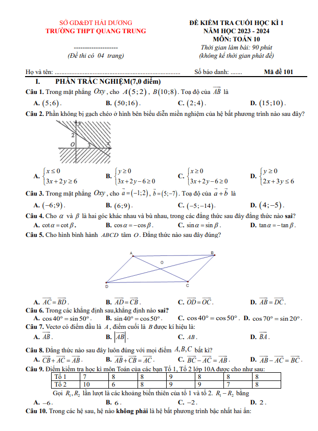 Đề Kiểm Tra Cuối Học Kì 1 Toán Lớp 10 Năm 2023 – 2024 Trường THPT Quang Trung Hải Dương