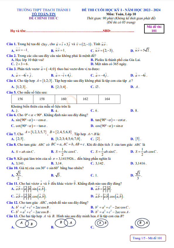 Xin chào quý thầy cô và các em học sinh lớp 10! Hôm nay, Sytu xin giới thiệu đến các bạn đề thi cuối học kỳ 1 môn Toán lớp 10 năm học 2023 – 2024 của trường THPT Thạch Thành 1, Thanh Hóa. Đề thi này bao gồm câu hỏi trắc nghiệm với mã đề 101 – 102.