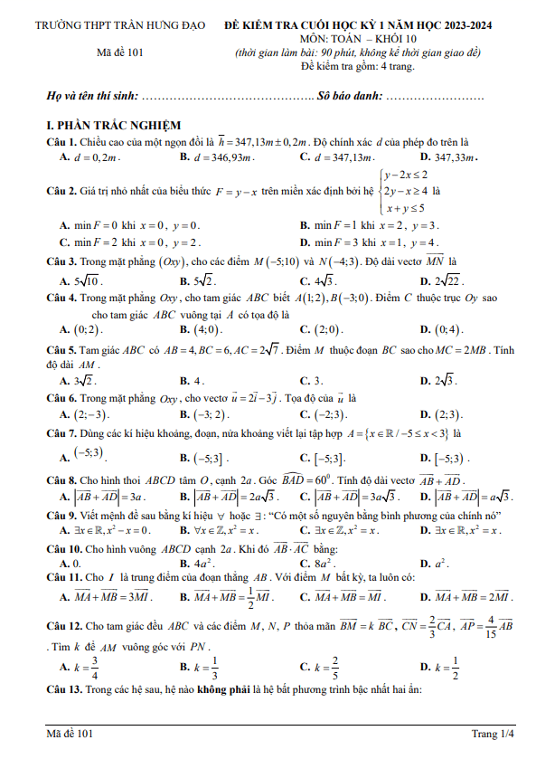 Đề cuối học kỳ 1 Toán lớp 10 năm học 2023 – 2024