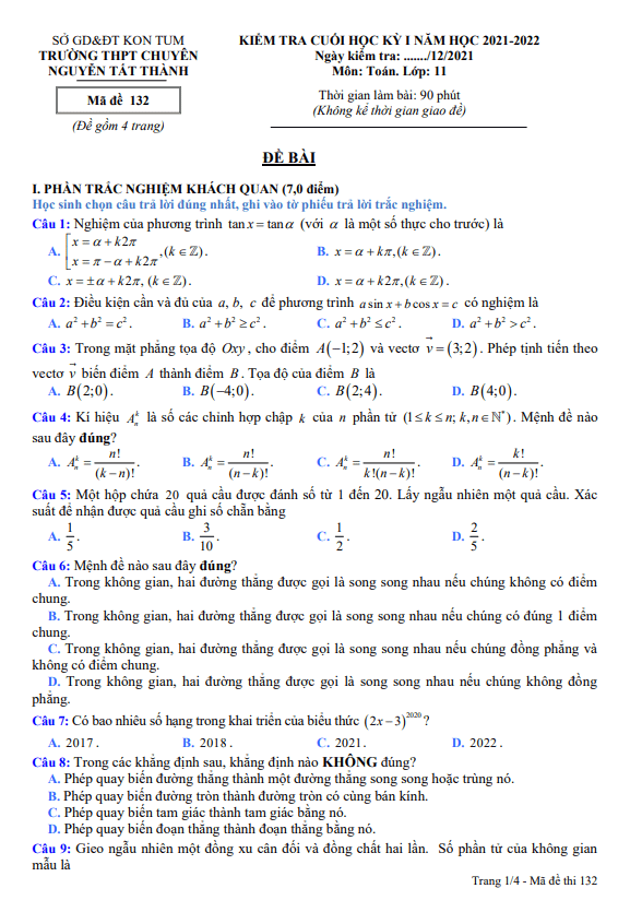 Đề cuối học kì 1 (HK1) lớp 11 môn Toán năm 2021 2022 trường chuyên Nguyễn Tất Thành Kon Tum