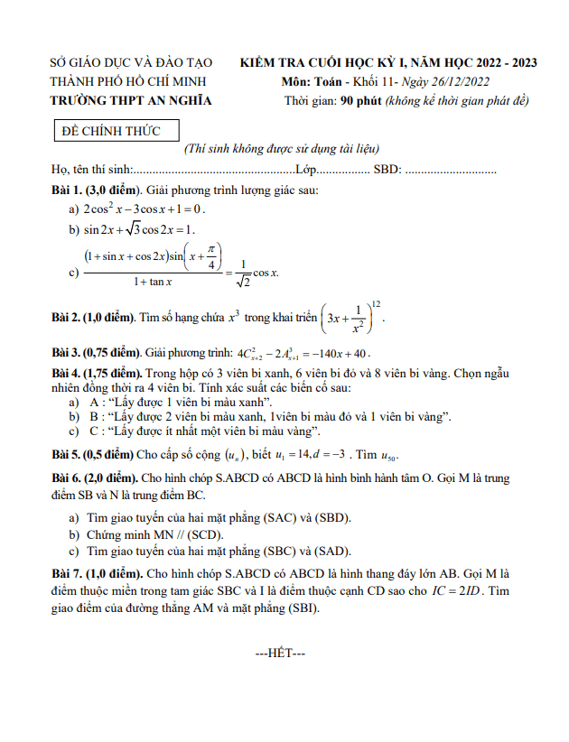 Đề thi cuối kỳ 1 môn Toán lớp 11 năm học 2022 – 2023 trường THPT An Nghĩa TP HCM
