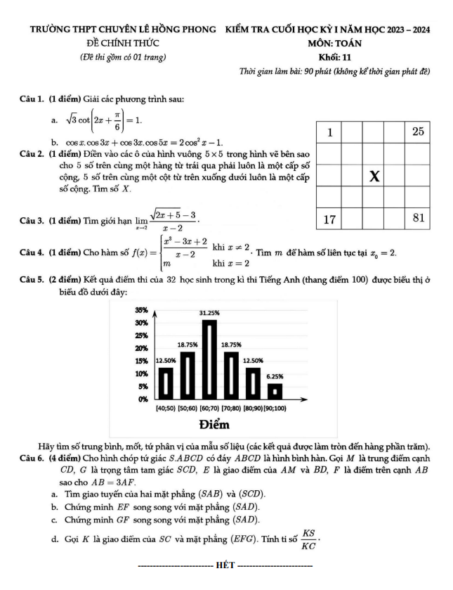 Đề cuối học kì 1 môn Toán lớp 11 năm 2023 2024 của trường chuyên Lê Hồng Phong TP HCM là một bài kiểm tra mang tính quyết định đối với việc đánh giá kiến thức và kỹ năng của học sinh. Với nhiều dạng bài toán phong phú và đa dạng, đề thi đòi hỏi sự tổng hợp và ứng dụng hiệu quả của học sinh. Bên cạnh đó, việc giải quyết các bài toán đòi hỏi sự logic, suy luận và sáng tạo từ phía học sinh.