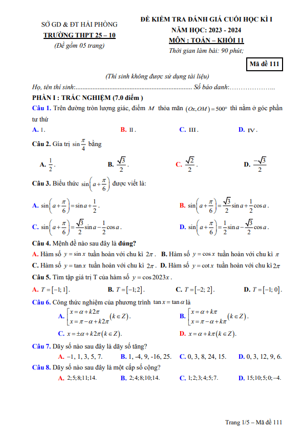 Đề HK1 Toán 11