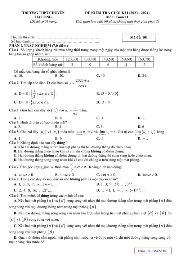 Chào các thầy cô và các em học sinh lớp 11. Đây là đề kiểm tra cuối học kì 1 môn Toán lớp 11 năm học 2023 – 2024 của trường THPT chuyên Hạ Long, tỉnh Quảng Ninh (mã đề 101).