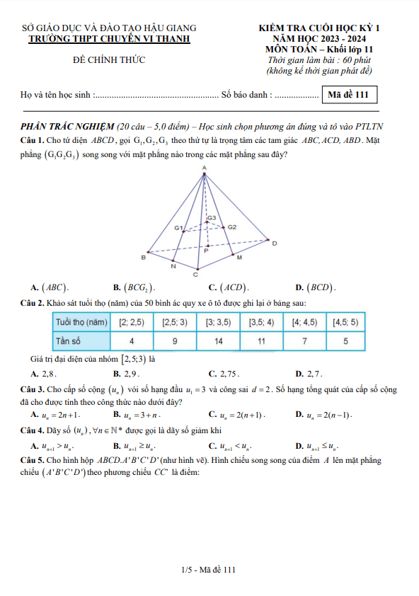 Đề kiểm tra cuối học kỳ 1 môn Toán lớp 11 năm học 2023-2024 trường THPT chuyên Vị Thanh Hậu GiangXin chào quý thầy, cô giáo và các em học sinh lớp 11. Trong đề thi cuối kỳ 1 môn Toán năm học 2023-2024 của trường THPT chuyên Vị Thanh, tỉnh Hậu Giang, chúng ta sẽ gặp phải những câu hỏi thú vị và đầy thách thức. Mỗi câu hỏi không chỉ giúp chúng ta kiểm tra kiến thức mà còn khuyến khích sự sáng tạo và tư duy logic.1. Câu hỏi đầu tiên yêu cầu chúng ta chứng minh một mệnh đề về hình chóp S.ABCD. Đây là một bài toán về hình học không gian, đòi hỏi chúng ta phải có kiến thức vững chắc về tính chất của hình chóp và trung điểm.2. Câu hỏi thứ hai liên quan đến vật lý và toán học. Chúng ta cần tính toán tổng quãng đường mà quả bóng đã di chuyển khi nảy lên từ độ cao ban đầu. Đề bài sẽ giúp chúng ta kết hợp kiến thức phức tạp từ cả hai môn học để giải quyết vấn đề.3. Câu hỏi cuối cùng liên quan đến dãy số và cấp số nhân. Chúng ta cần xác định công bội của dãy số và số hạng đầu tiên để có thể xác định được luật cấp số nhân đó.Thông qua những câu hỏi này, chúng ta sẽ được thách thức, học hỏi và phát triển kỹ năng giải quyết vấn đề. Hy vọng rằng mọi người sẽ vượt qua thử thách này một cách thành công và tự tin. Chúc quý thầy cô và các em học sinh đạt kết quả cao trong kỳ thi sắp tới. Trân trọng cảm ơn!