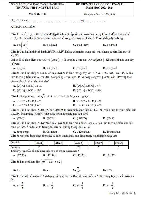 Trích dẫn Đề cuối kỳ 1 Toán lớp 11 năm 2023 – 2024 trường THPT Nguyễn Trãi – Khánh Hòa: