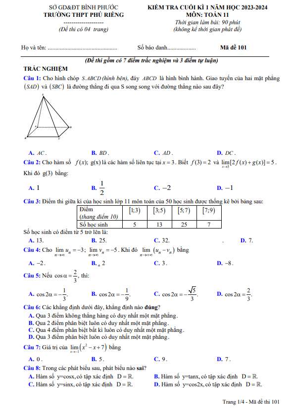 Đề cuối kì 1 Toán lớp 11 năm học 2023 – 2024 trường THPT Phú Riềng Bình PhướcChào các thầy cô và các em học sinh lớp 11! Hôm nay, Sytu xin giới thiệu đến quý vị đề kiểm tra cuối học kì 1 môn Toán lớp 11 năm học 2023 – 2024 của trường THPT Phú Riềng, tỉnh Bình Phước. Đề thi này có mã đề 101 và đi kèm đáp án chi tiết.1. Cho hình chóp S.ABCD có đáy ABCD là hình chữ nhật. Gọi M, N, P lần lượt là trung điểm của các cạnh SA, SC, SD. Hãy chứng minh rằng mặt phẳng (MNP) song song với mặt phẳng (ABCD).2. Bạn Việt muốn trang trí một mảng tường hình vuông cạnh bằng 1m cho quán trà sữa của mình. Anh ấy đã quyết định tô màu các hình vuông nhỏ theo quy tắc, và muốn biết sau bao nhiêu bước tô màu, diện tích hình vuông được tô sẽ nhỏ hơn 1/1000 m².3. Với điểm thi giữa kỳ của 50 học sinh lớp 11 môn Toán, chúng ta cần tính giá trị trung vị của bảng điểm được thống kê.Đây chính là những bài toán thú vị và thách thức trong đề thi cuối kì 1 môn Toán lớp 11 năm học 2023 – 2024. Hy vọng rằng các em sẽ tự tin và thành công trong việc giải quyết các bài toán này. Chúc các em đạt kết quả cao trong kỳ thi sắp tới! File WORD của đề thi đã được chuẩn bị sẵn sàng cho quý thầy, cô giáo. Chúc quý thầy cô có một ngày làm việc hiệu quả!