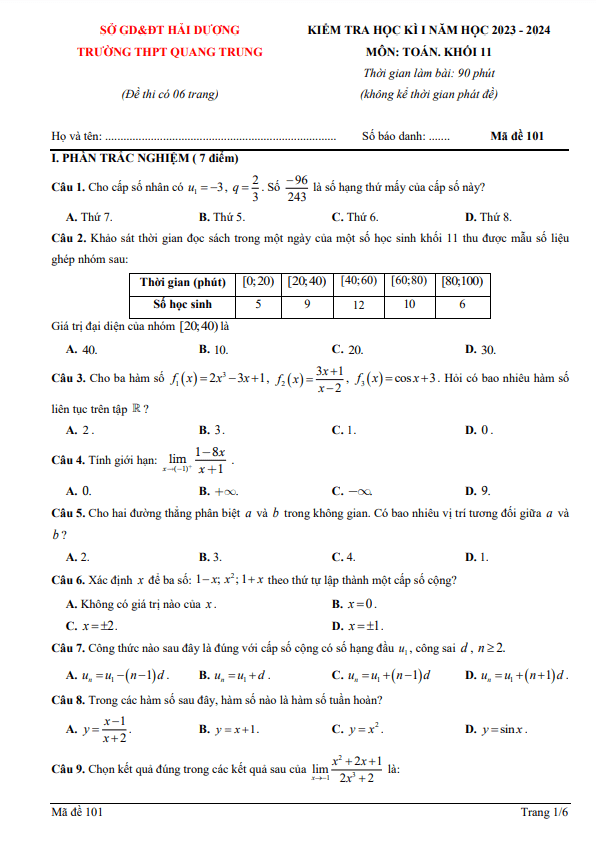Chào quý thầy cô và các bạn học sinh lớp 11, đề thi cuối học kì 1 môn Toán năm học 2023-2024 của trường THPT Quang Trung Hải Dương đã được công bố. Đề thi bao gồm các câu hỏi trắc nghiệm và tự luận, kèm theo đáp án chi tiết và hướng dẫn chấm điểm.