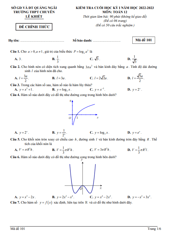 Xin chào quý thầy cô và các em học sinh lớp 12! Để chuẩn bị cho kỳ thi cuối học kì 1, trường chuyên Lê Khiết Quảng Ngãi đã tổ chức ra đề kiểm tra chất lượng môn Toán lớp 12 năm học 2022 – 2023. Đề bao gồm 50 câu trắc nghiệm trên 06 trang, thời gian làm bài 90 phút (không tính thời gian phát đề).