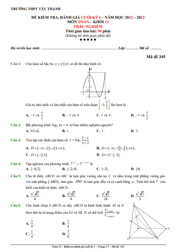 Đề cuối học kì 1 môn Toán lớp 12 năm học 2022 – 2023 trường THPT Tây Thạnh, TP HCM