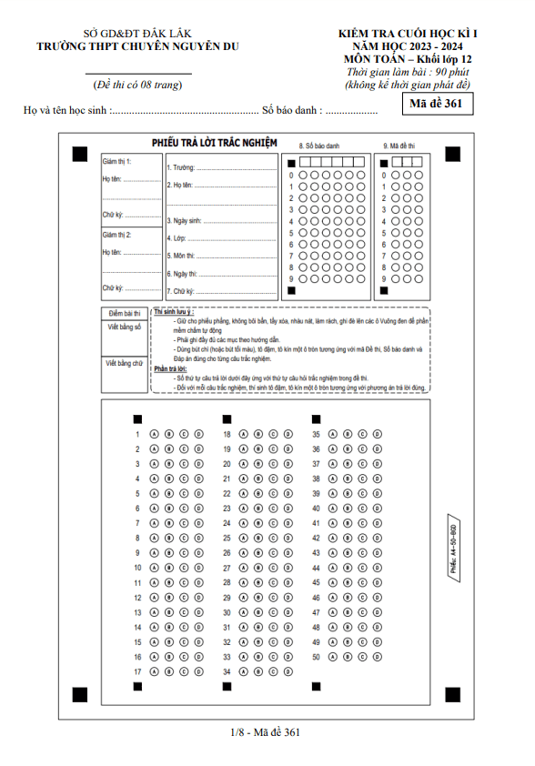 Chúng ta hãy cùng đến với đề kiểm tra cuối học kì 1 môn Toán lớp 12 năm học 2023 – 2024 tại trường THPT chuyên Nguyễn Du, tỉnh Đắk Lắk. Đề thi này bao gồm mã đề 361, 362, 363 và 364 với đáp án trắc nghiệm.
