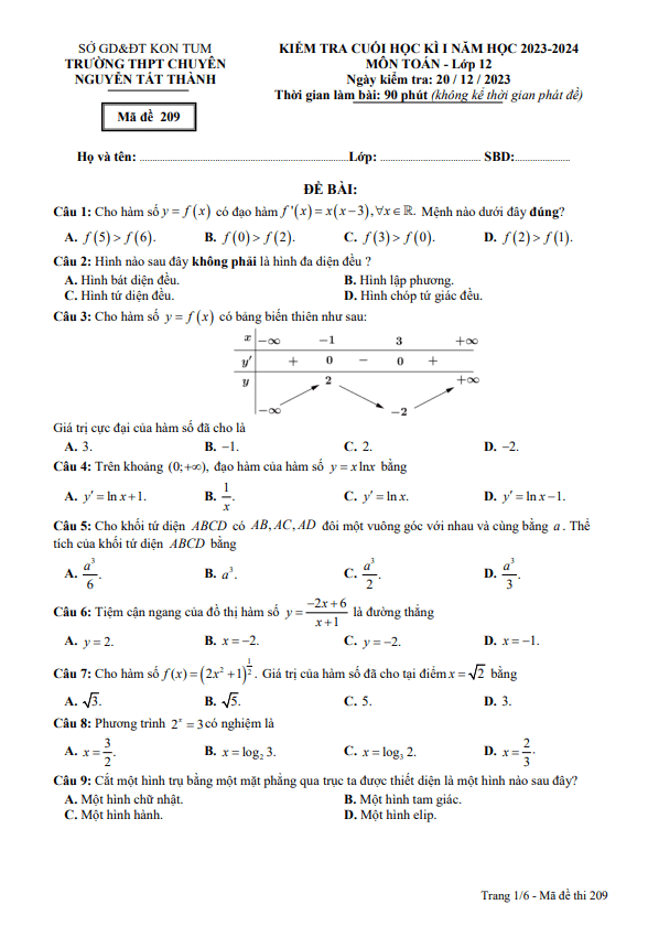 Đề thi cuối kì 1 môn Toán lớp 12 năm học 2023 – 2024 trường chuyên Nguyễn Tất Thành Kon Tum