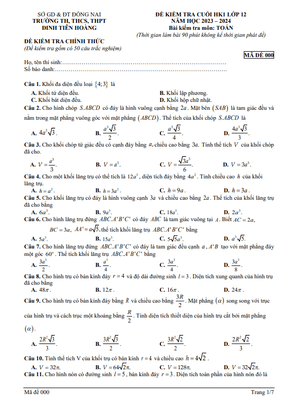 Sytu xin gửi đến quý thầy cô và các em học sinh lớp 12 đề thi cuối học kỳ 1 môn Toán năm học 2023 – 2024 của trường TH – THCS – THPT Đinh Tiên Hoàng, tỉnh Đồng Nai. Đề thi bao gồm mã đề 000 với các câu hỏi trắc nghiệm sau đây: