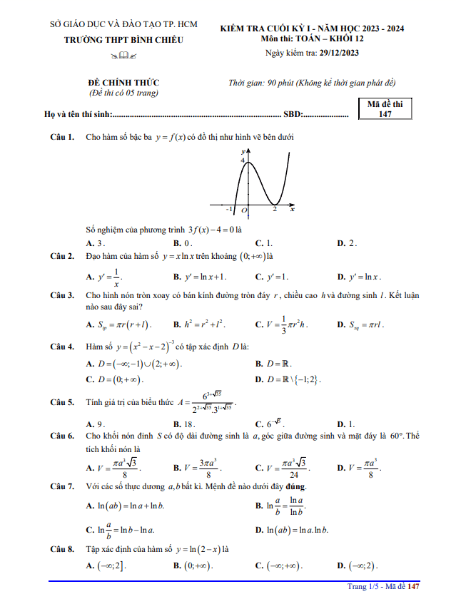 Sytu xin gửi đến quý thầy cô và các em học sinh lớp 12 đề kiểm tra cuối học kỳ 1 môn Toán năm học 2023-2024 của trường THPT Bình Chiểu, thành phố Hồ Chí Minh. Đề thi bao gồm đáp án trắc nghiệm với mã đề 147-226-321-457.