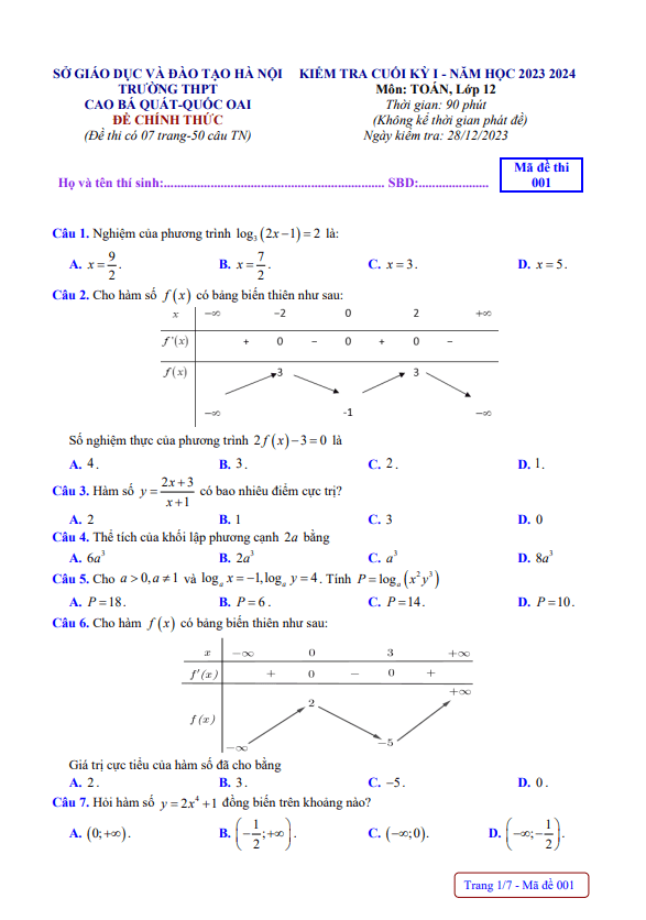 Đề cuối kỳ 1 Toán lớp 12 năm học 2023 – 2024 THPT Cao Bá Quát Hà Nội