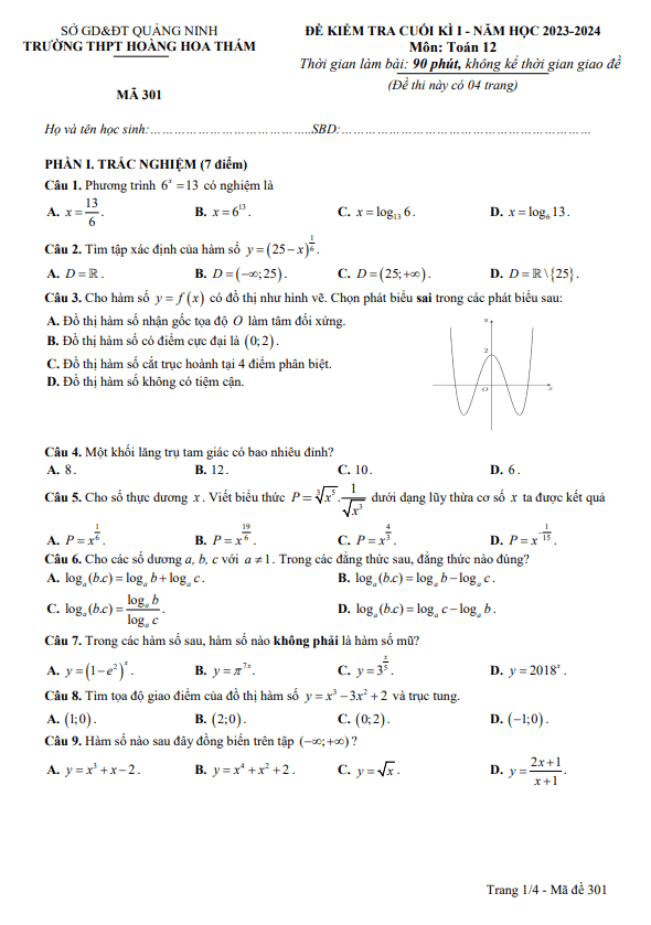 Đề thi cuối kỳ 1 môn Toán lớp 12 năm học 2023 – 2024 của trường THPT Hoàng Hoa Thám, Quảng Ninh với nhiều câu hỏi đa dạng và phong phú, giúp học sinh rèn luyện kỹ năng, kiến thức Toán cần thiết cho bài kiểm tra. Trong đó, có các câu hỏi như:1. Về hình trụ có tỉ số giữa diện tích toàn phần và diện tích xung quanh bằng 4, câu hỏi yêu cầu học sinh suy luận và tính toán để chọn ra khẳng định đúng nhất.2. Về hình nón tròn xoay, học sinh sẽ phải áp dụng kiến thức về hình học không gian để tính diện tích thiết diện đi qua đỉnh của hình nón.3. Về hàm số, học sinh sẽ phải phân tích đồ thị và đưa ra phát biểu sai trong số những phát biểu cho trước.Đề thi này không chỉ giúp học sinh ôn tập kiến thức mà còn giúp họ phát triển kỹ năng giải quyết vấn đề, tư duy logic và phân tích. Điều này sẽ giúp họ chuẩn bị tốt hơn cho kỳ thi sắp tới.