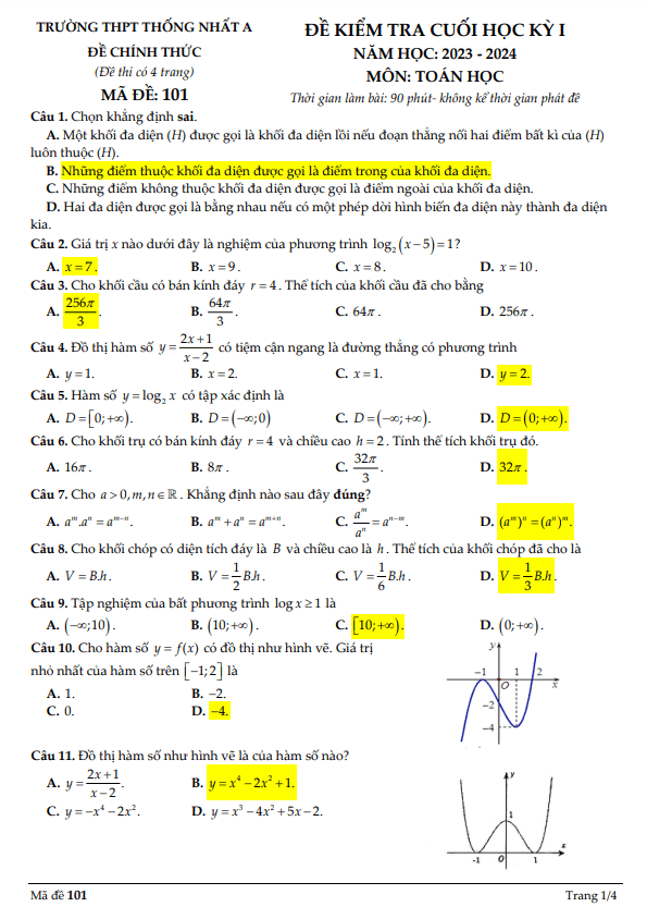 Xin chào quý thầy cô và các em học sinh lớp 12! Hôm nay, mình xin giới thiệu đến các bạn bộ đề kiểm tra cuối học kỳ 1 môn Toán lớp 12 năm học 2023 – 2024 tại trường THPT Thống Nhất A, tỉnh Đồng Nai. Đề thi này bao gồm các mã đề trắc nghiệm 101, 102, 103, 104.