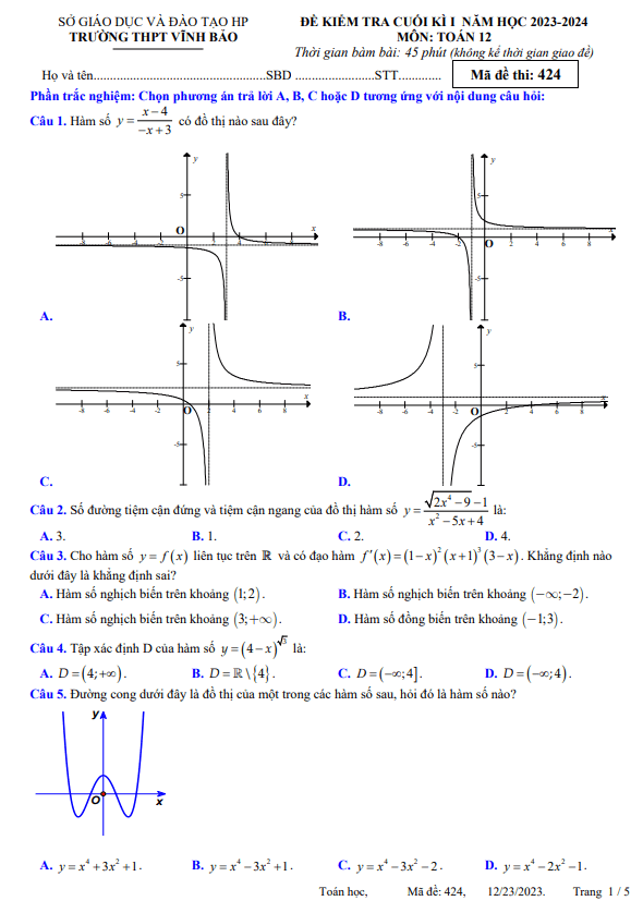 Xin chào quý thầy cô và các em học sinh lớp 12! Sytu xin giới thiệu Đề cuối kì 1 môn Toán lớp 12 năm học 2023 – 2024 của trường THPT Vĩnh Bảo, Hải Phòng. Đề thi bao gồm các câu hỏi có đáp án mã đề từ 424 đến 457.