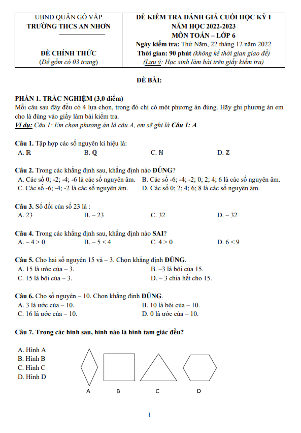 Để kiểm tra cuối học kỳ 1 môn Toán lớp 6 năm học 2022 – 2023 trường THCS An Nhơn, quận Gò Vấp, thành phố Hồ Chí Minh sẽ được tổ chức vào ngày 22 tháng 12 năm 2022. Đề thi bao gồm các câu hỏi trắc nghiệm và có hướng dẫn giải chi tiết cho phần tự luận.