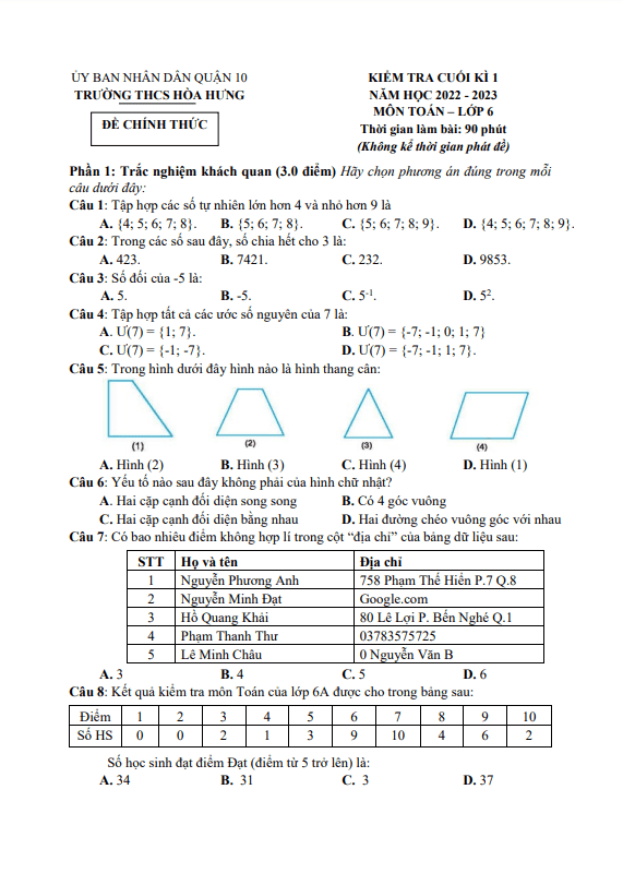 Trích dẫn Đề cuối kì 1 Toán lớp 6 năm 2022 – 2023 trường THCS Hòa Hưng – TP HCM: