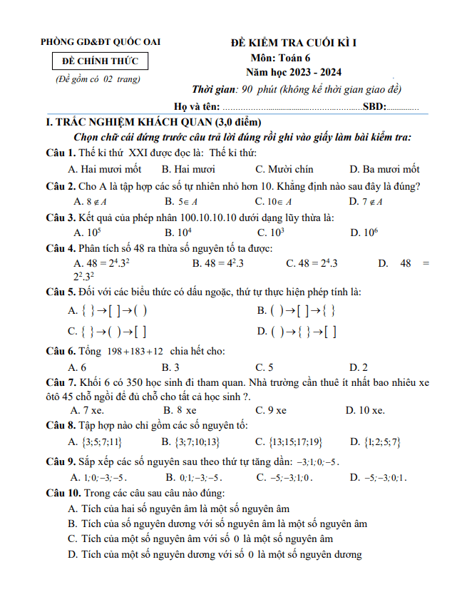 Đề cuối kì 1 Toán lớp 6 năm học 2023 – 2024 phòng GD&ĐT Quốc Oai – Hà Nội