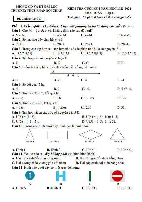 Đề kiểm tra cuối học kỳ 1 môn Toán lớp 6 năm học 2023 – 2024 Trường THCS Phan Bội Châu