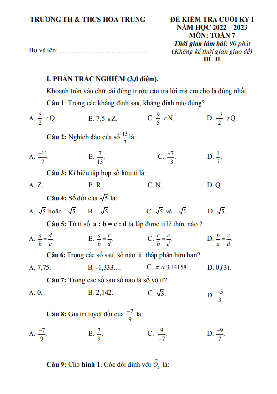 Đề cuối học kì 1 (HK1) lớp 7 môn Toán năm 2022 2023 trường TH THCS Hóa Trung Thái Nguyên