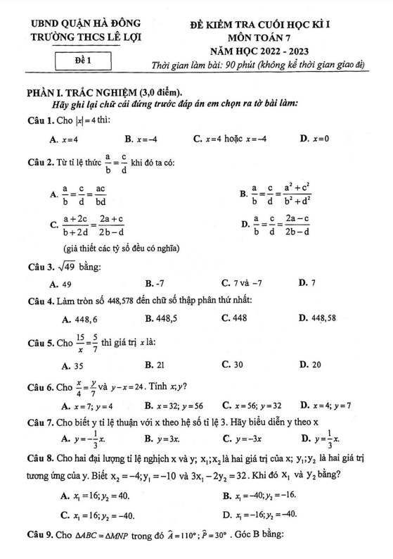 Xin chào quý thầy cô và các em học sinh lớp 7! Hôm nay, Sytu xin giới thiệu đến quý vị đề kiểm tra cuối học kì 1 môn Toán lớp 7 năm học 2022 – 2023 tại trường THCS Lê Lợi, quận Hà Đông, thành phố Hà Nội. Đề thi bao gồm 02 trang với tổng cộng 12 câu trắc nghiệm (mỗi câu 03 điểm) và 05 câu tự luận (mỗi câu 07 điểm), thời gian làm bài là 90 phút.