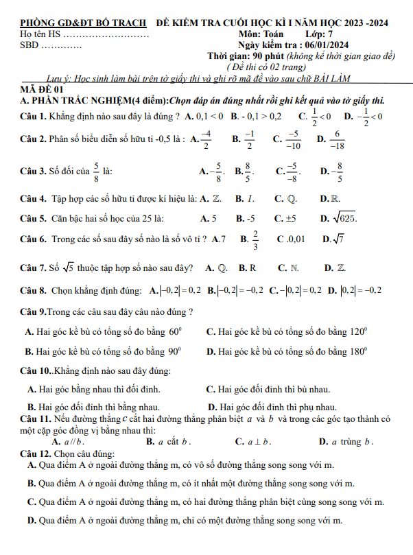 Sytu trân trọng giới thiệu Đề kiểm tra cuối học kì 1 môn Toán lớp 7 năm học 2023 – 2024 của phòng Giáo dục và Đào tạo huyện Bố Trạch, tỉnh Quảng Bình. Đề thi sẽ diễn ra vào ngày 06 tháng 01 năm 2024, bao gồm đáp án và hướng dẫn chấm điểm. Một số câu hỏi trong đề thi bao gồm:1. Trong các dãy dữ liệu sau, đâu là dãy số liệu?A. Kết quả điểm kiểm tra môn Toán của 3 bạn học sinh lớp 7A: 8,5; 6,3; 5,8.B. Tên một số tỉnh thuộc đồng bằng sông Hồng: Nam Định, Thái Bình, Hưng Yên.C. Kết quả xếp loại học lực của học 3 bạn học sinh lớp 7A: Xuất sắc, Tốt, Khá.D. Các môn thể thao yêu thích của các bạn lớp 7A: Bóng chuyền, đá bóng, cầu lông.2. Biểu đồ dưới đây cho biết tỉ lệ các môn thể thao được yêu thích của 90 bạn học sinh khối 7 ở một trường THCS. – Trong biểu đồ trên, hình tròn được chia thành mấy hình quạt mỗi hình quạt biểu diễn số liệu nào?- Môn thể thao nào được các bạn học sinh khối 7 yêu thích nhất?- Có bao nhiêu bạn thích chơi cầu lông?3. Trong định lí: “Hai đường thẳng phân biệt cùng vuông góc với một đường thẳng thứ ba thì chúng song song với nhau” phần giả thiết là:A. “Hai đường thẳng phân biệt cùng vuông góc với một đường thẳng thứ ba”.B. “Chúng song song với nhau”.C. “Hai đường thẳng phân biệt cùng vuông góc”.D. “Hai đường thẳng phân biệt”.Hãy nắm bắt kiến thức và thực hành để chuẩn bị tốt cho kỳ thi cuối kì đầy thách thức này. Chúc các em học sinh lớp 7 thành công trong kỳ thi sắp tới!