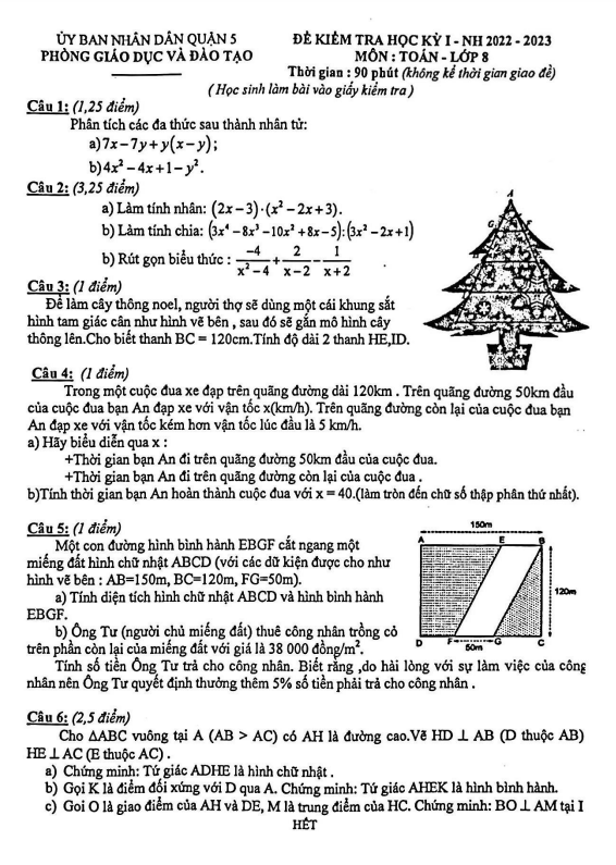 Đề cuối học kì 1 (HK1) lớp 8 môn Toán năm 2022 2023 phòng GD ĐT Quận 5 TP HCM