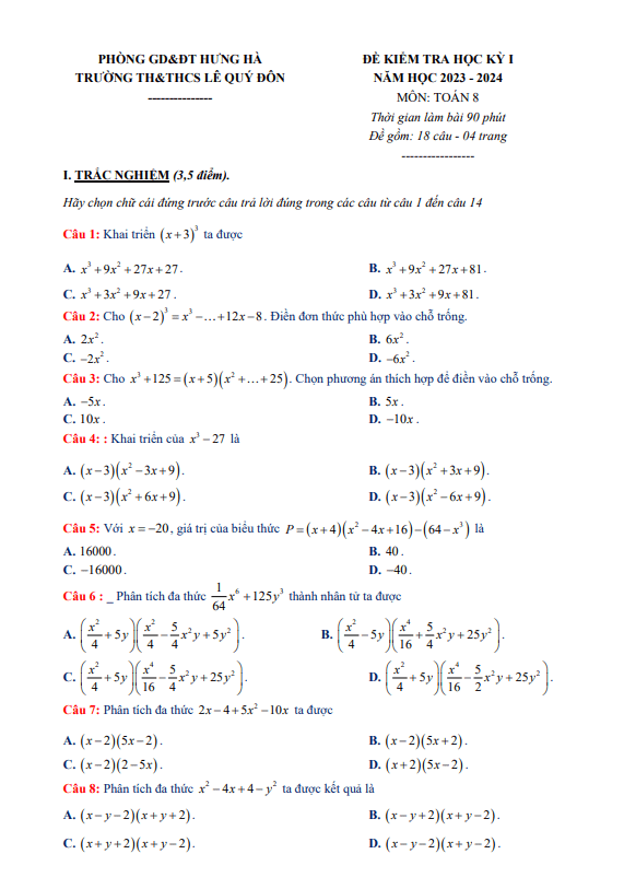 Đề cuối học kỳ 1 Toán lớp 8 năm học 2023 – 2024 trường TH&THCS Lê Quý Đôn – Thái Bình