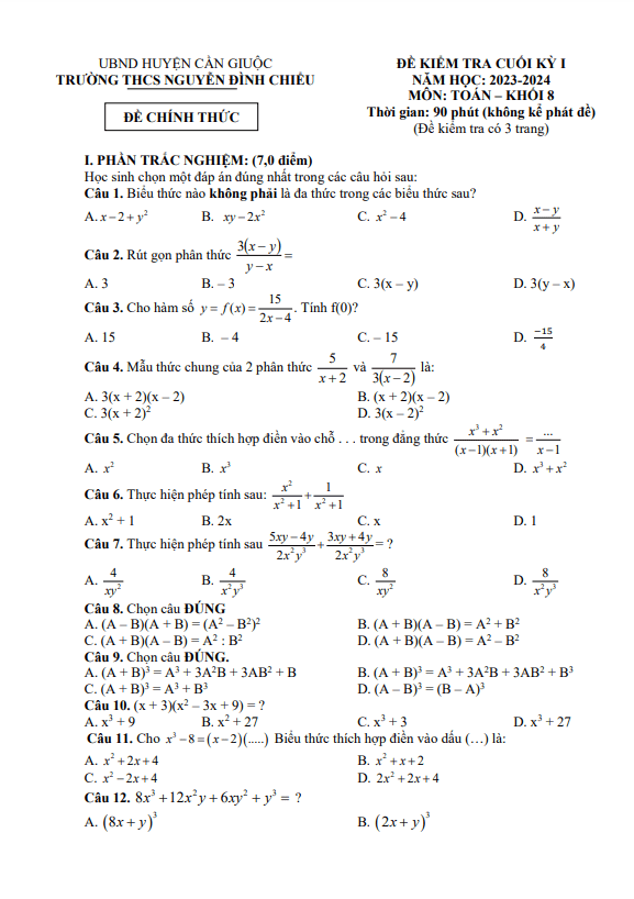 Đề cuối kỳ 1 Toán lớp 8 năm 2023 – 2024 trường THCS Nguyễn Đình Chiểu – Long An