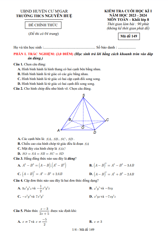 Đề cuối học kì 1 Toán lớp 8 năm 2023 – 2024 trường THCS Nguyễn Huệ – Đắk Lắk