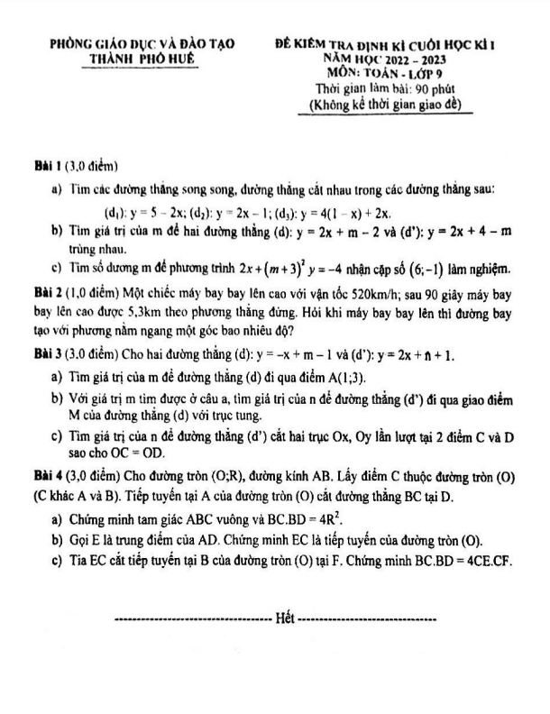 Chào các thầy cô giáo và các em học sinh lớp 9! Hôm nay Sytu xin giới thiệu đến quý vị đề kiểm tra cuối học kì 1 môn Toán lớp 9 năm học 2022-2023 của phòng Giáo dục và Đào tạo thành phố Huế. Hãy cùng nhau tìm hiểu các câu hỏi sau đây: