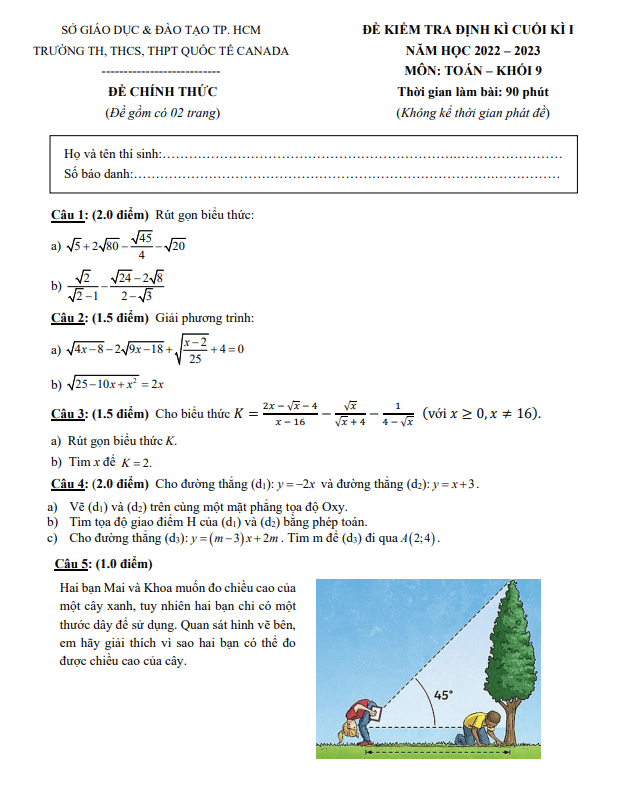 Đề cuối kì 1 Toán lớp 9 năm 2022 – 2023 trường Quốc tế Canada TP HCM