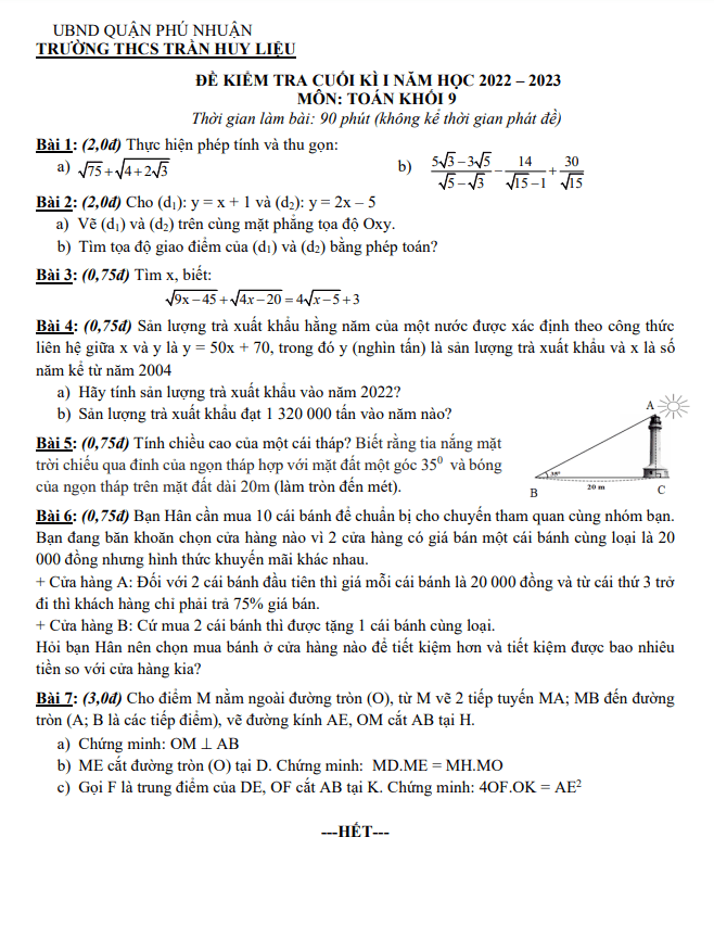 Đề cuối học kì 1 môn Toán lớp 9 năm 2022 – 2023 THCS Trần Huy Liệu TP HCM