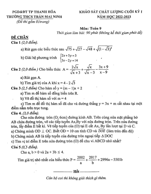 Đề cuối học kì 1 (HK1) lớp 9 môn Toán năm 2022 2023 trường THCS Trần Mai Ninh Thanh Hóa