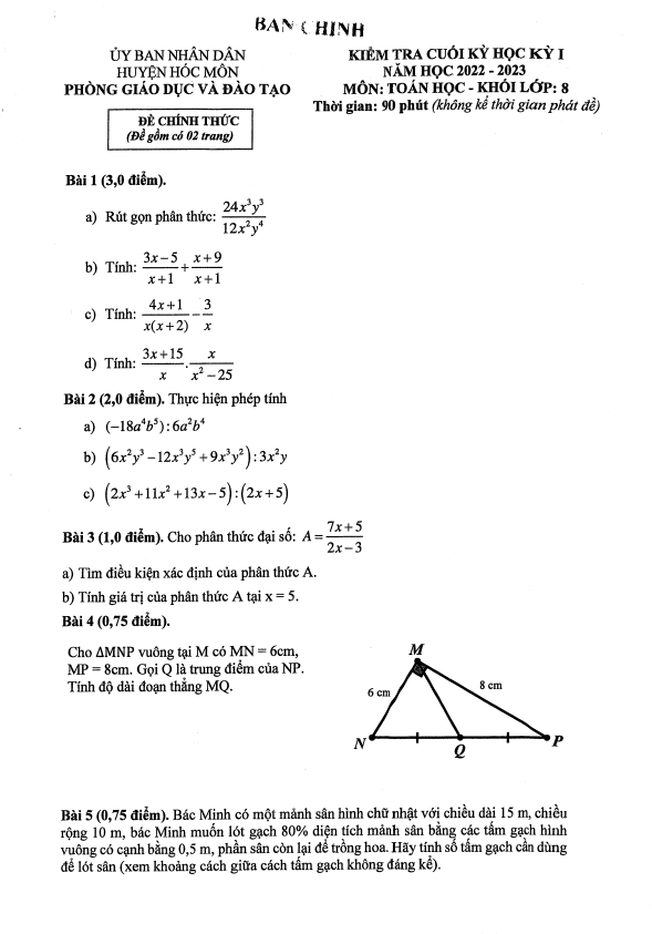 Đề cuối học kì 1 Toán 8 năm 2022 2023 phòng GD ĐT Hóc Môn TP HCM