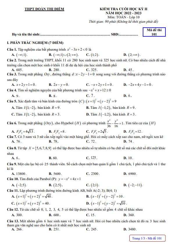 Đề cuối học kỳ 2 môn Toán lớp 10 năm 2022 – 2023 trường THPT Đoàn Thị Điểm Quảng Ninh