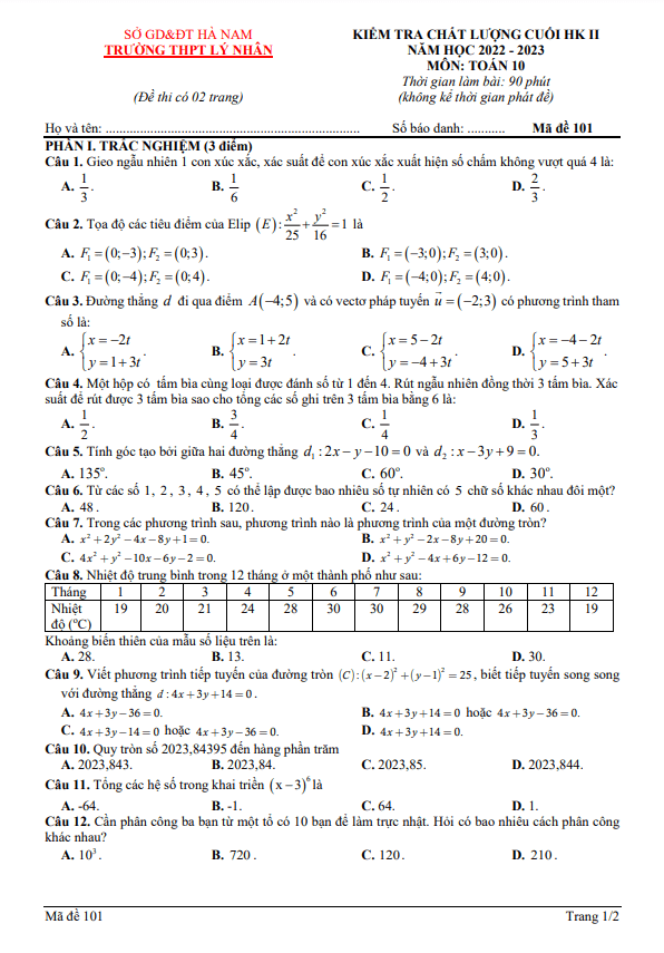 Đề cuối học kì 2 (HK2) lớp 10 môn Toán năm 2022 2023 trường THPT Lý Nhân Hà Nam