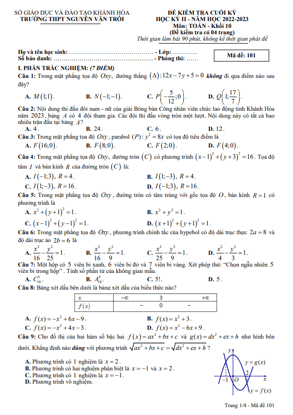 Đề cuối học kì 2 (HK2) lớp 10 môn Toán năm 2022-2023 trường THPT Nguyễn Văn Trỗi Khánh HòaXin chào quý thầy cô và các em học sinh lớp 10! Sytu xin giới thiệu đến các bạn đề kiểm tra cuối học kỳ 2 môn Toán lớp 10 năm học 2022-2023 tại trường THPT Nguyễn Văn Trỗi, tỉnh Khánh Hòa. Đề thi bao gồm các câu trắc nghiệm mã đề 101.Dưới đây là một số câu hỏi trong đề thi:1. Nội dung thi đấu đôi nam-nữ của giải Bóng bàn Công nhân viên chức lao động tỉnh Khánh Hòa năm 2023, bảng A có 4 đội tham gia. Các đội thi đấu vòng tròn một lượt. Hỏi bảng A có tất cả bao nhiêu trận đấu?2. Một người đang lập trình trò chơi trên máy tính và cần viết lệnh cho đường đi của một điểm M xy từ vị trí A(1;-2), chuyển động thẳng đều với vectơ vận tốc v = (3;5). Phương trình tham số của đường thẳng biểu diễn đường đi của điểm M là gì?3. Hội cha mẹ học sinh lớp 10A tổ chức cho học sinh ăn sáng tại nhà hàng. Nhà hàng có hai loại combo: Loại 1 giá 89000 VNĐ bao gồm 1 món ăn và 1 món uống, loại 2 giá 99000 VNĐ cũng bao gồm 1 món ăn và 1 món uống. Hỏi mỗi học sinh lớp 10A có bao nhiêu cách lựa chọn 1 combo?Hãy tham gia thử thách và thể hiện khả năng của mình trong đề thi cuối kỳ 2 môn Toán năm học 2022-2023. Chúc các em thành công!