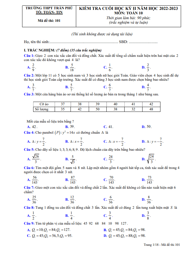 Trong bài kiểm tra cuối kỳ 2 môn Toán lớp 10 năm học 2022 – 2023 của Trường THPT Trần Phú, tỉnh Phú Yên, đề thi được chia thành hai phần: 70% trắc nghiệm và 30% tự luận. Thời gian làm bài là 90 phút, không tính thời gian phát đề. Đề thi bao gồm các mã đề 101, 102, 103 và 104, mỗi đề đều có đáp án và lời giải chi tiết.