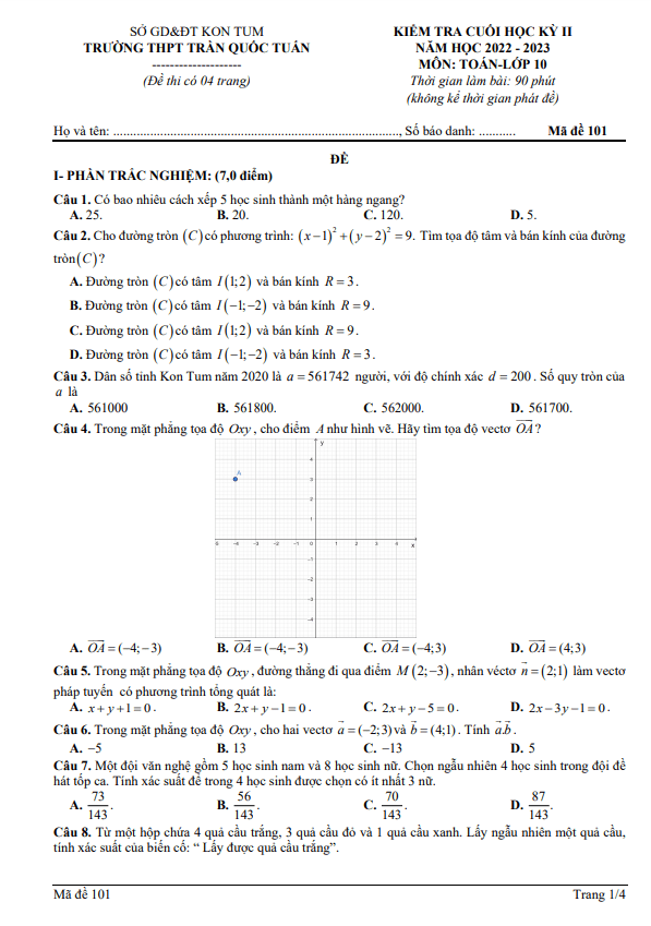 Đề cuối kỳ 2 Toán lớp 10 năm học 2022 – 2023 trường THPT Trần Quốc Tuấn – Kon Tum