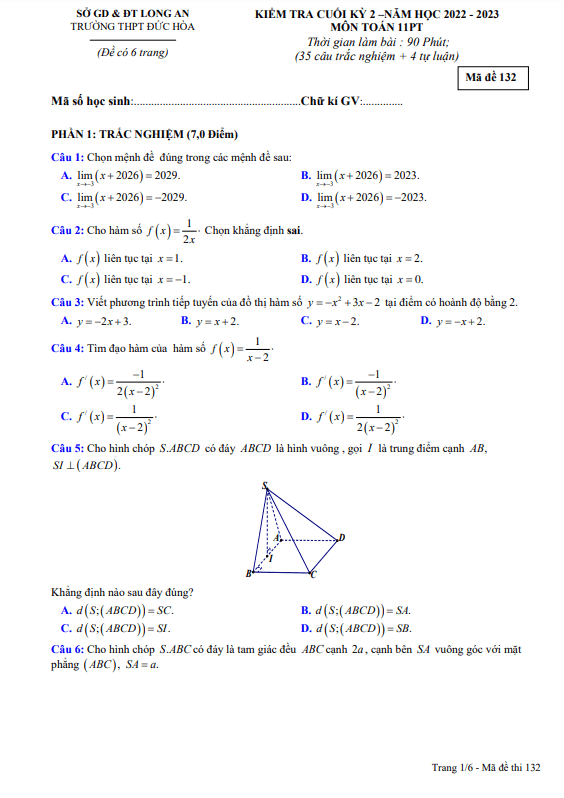 Sytu xin gửi đến quý thầy cô và các em học sinh lớp 11 đề thi cuối học kỳ 2 môn Toán năm học 2022 – 2023 của trường THPT Đức Hòa, Long An. Đề thi bao gồm các câu hỏi trắc nghiệm và hướng dẫn giải chi tiết cho phần tự luận với mã đề 132, 209, 357, 485, 570, 628.