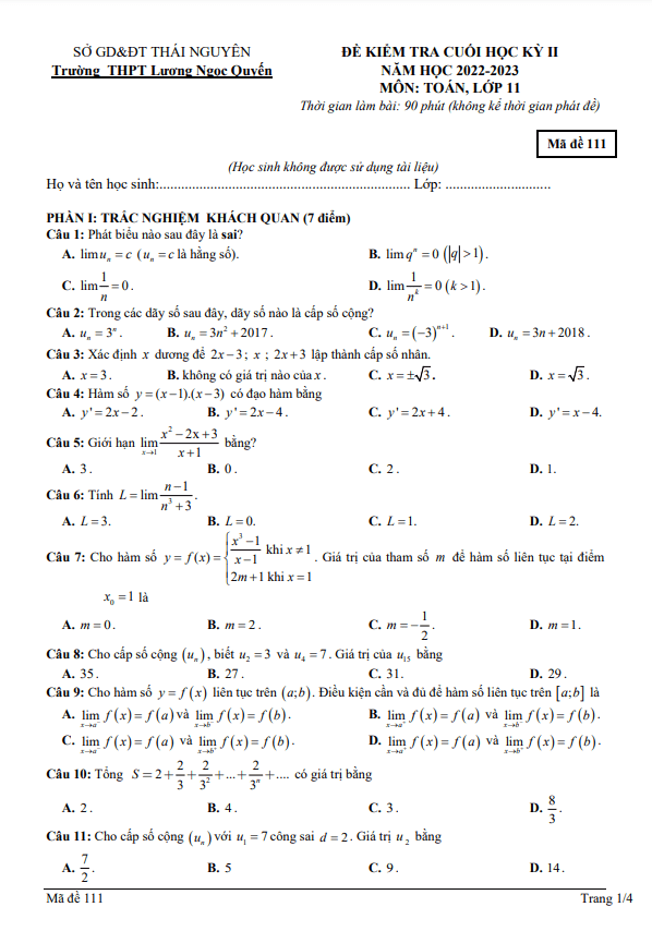 Đề cuối học kì 2 (HK2) lớp 11 môn Toán năm 2022 2023 trường THPT Lương Ngọc Quyến Thái NguyênSytu xin được giới thiệu đến quý thầy, cô giáo và các em học sinh lớp 11 đề kiểm tra cuối học kì 2 môn Toán lớp 11 năm học 2022 – 2023 trường THPT Lương Ngọc Quyến, tỉnh Thái Nguyên. Đề thi có hình thức 70% trắc nghiệm + 30% tự luận, thời gian làm bài 90 phút (không kể thời gian phát đề). Đề thi bao gồm các câu hỏi trắc nghiệm và tự luận, và có đáp án cùng hướng dẫn chấm điểm mã đề 111 112 113 114 115 116 117 118.Dưới đây là một số câu hỏi trong Đề cuối kì 2 Toán lớp 11 năm 2022 – 2023 trường THPT Lương Ngọc Quyến – Thái Nguyên:1. Khẳng định nào sau đây là đúng?A. Có nhiều đường thẳng đi qua một điểm cho trước và vuông góc với mặt phẳng cho trước.B. Có nhiều mặt phẳng đi qua một điểm cho trước và vuông góc với đường thẳng cho trước.C. Đường thẳng vuông góc với một mặt phẳng thì vuông góc với mọi đường thẳng nằm trong mặt phẳng.D. Nếu một đường thẳng vuông góc với hai đường thẳng cùng nằm trong một mặt phẳng thì nó vuông góc với mặt phẳng ấy.2. Hãy cho biết mệnh đề nào sau đây là sai?Hai đường thẳng vuông góc nếu:A. tích vô hướng giữa hai vectơ chỉ phương của chúng là bằng 0.B. góc giữa hai đường thẳng đó là 0 hoặc 90 độ.C. góc giữa hai vectơ chỉ phương của chúng là 0 độ.D. góc giữa hai vectơ chỉ phương của chúng là 90 độ.3. Một vật chuyển động theo quy luật s = 1/3t^2 + 9t + 3 với t tính bằng giây và s tính bằng mét. Tính vận tốc lớn nhất của vật đạt được trong khoảng thời gian 10 giây, kể từ lúc bắt đầu chuyển động.Đây là một số câu hỏi đặc biệt trong Đề cuối kỳ 2 môn Toán lớp 11 năm 2022 – 2023 trường THPT Lương Ngọc Quyến Thái Nguyên. Hy vọng rằng các em học sinh sẽ tự tin và thành công trong kỳ thi sắp tới. Chúc quý thầy, cô và các em có một kỳ thi suôn sẻ và đạt kết quả cao. Xin cám ơn!