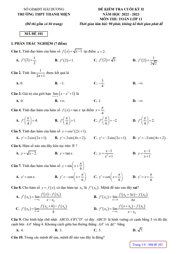 Đề cuối học kì 2 (HK2) lớp 11 môn Toán năm 2022 2023 trường THPT Thanh Miện Hải Dương
