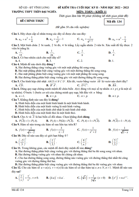 Sytu xin gửi đến quý thầy cô và các em học sinh lớp 11 đề thi cuối học kỳ 2 môn Toán năm học 2022 – 2023 từ trường THPT Trần Đại Nghĩa, Vĩnh Long. Đề thi bao gồm các câu hỏi trắc nghiệm mã đề từ 134 đến 256.Một trong những câu hỏi trong đề thi là về tam giác trung bình. Cụ thể, ta có tam giác đều với cạnh bằng 3 và xây dựng dãy tam giác trung bình theo nguyên tắc cho trước. Câu hỏi yêu cầu tính diện tích hình tròn ngoại tiếp tam giác ABC thứ n trong dãy.Câu hỏi tiếp theo đề cập đến hình chóp và góc giữa mặt chóp và mặt phẳng đáy. Với thông tin về hình chóp ABC và góc giữa SA và mặt phẳng ABC, cần tính số đo góc giữa SA và (SBC).Cuối cùng, đề thi đề cập đến không gian ba chiều và các điểm cách đều hai điểm cố định A và B. Câu hỏi yêu cầu tìm ra định nghĩa chính xác về mặt phẳng trung trực, đường thẳng vuông góc và mặt phẳng vuông góc.Đề thi Toán lớp 11 tại trường THPT Trần Đại Nghĩa, Vĩnh Long không chỉ thách thức kiến thức mà còn khuyến khích sự sáng tạo và tư duy logic của học sinh. Hy vọng các em sẽ vượt qua thử thách này một cách thành công và tự tin. Chúc quý thầy cô và các em có kỳ thi cuối kỳ 2 suôn sẻ và hiệu quả!