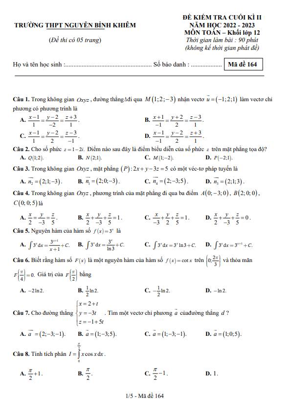 Sytu xin gửi đến quý thầy cô và các em học sinh lớp 12 đề kiểm tra cuối học kì 2 môn Toán lớp 12 năm học 2022-2023 trường THPT Nguyễn Bỉnh Khiêm, Đắk Lắk (mã đề 164).
