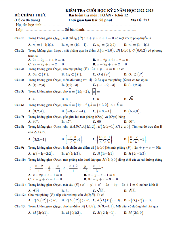 Chào các thầy cô và các bạn học sinh lớp 12! Sytu xin giới thiệu đến quý vị đề kiểm tra chất lượng cuối học kì 2 môn Toán lớp 12 năm học 2022 – 2023 tại trường THPT Nguyễn Tất Thành, thành phố Hồ Chí Minh. Đề thi sẽ bao gồm 50 câu hỏi và bài toán, thời gian làm bài là 90 phút.